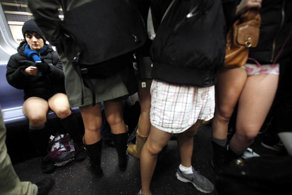 2010年1月10日,紐約,地鐵里一群不穿褲子的乘客。第9屆“不穿褲子乘地鐵”活動當(dāng)日在全球16個國家的44座城市舉行。圖片來源:中國新聞網(wǎng)