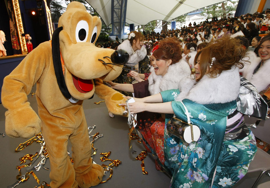1月11日,日本迎來2010年的成人節(jié)日,所有年滿20歲的年輕人都將在這一天宣告自己邁進了成人行列。眾多年輕的日本女孩身穿和服在東京迪斯尼樂園里快樂游玩,迎接自己的節(jié)日。