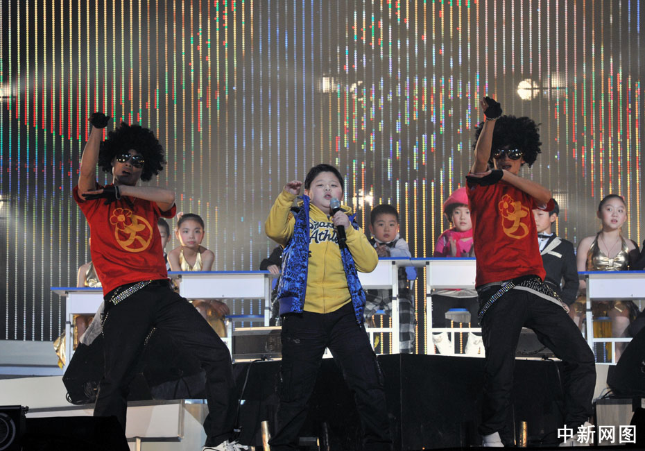 1月11日晚,第二屆音樂風(fēng)云榜新人盛典在京舉行,盛典現(xiàn)場的音樂課上,兒童版的Wonder Girl、Super Junior、邁克爾·杰克遜、曾軼可、大張偉紛紛登臺(tái)獻(xiàn)藝,讓現(xiàn)場觀眾們笑聲不斷。中新網(wǎng)記者 金碩 攝