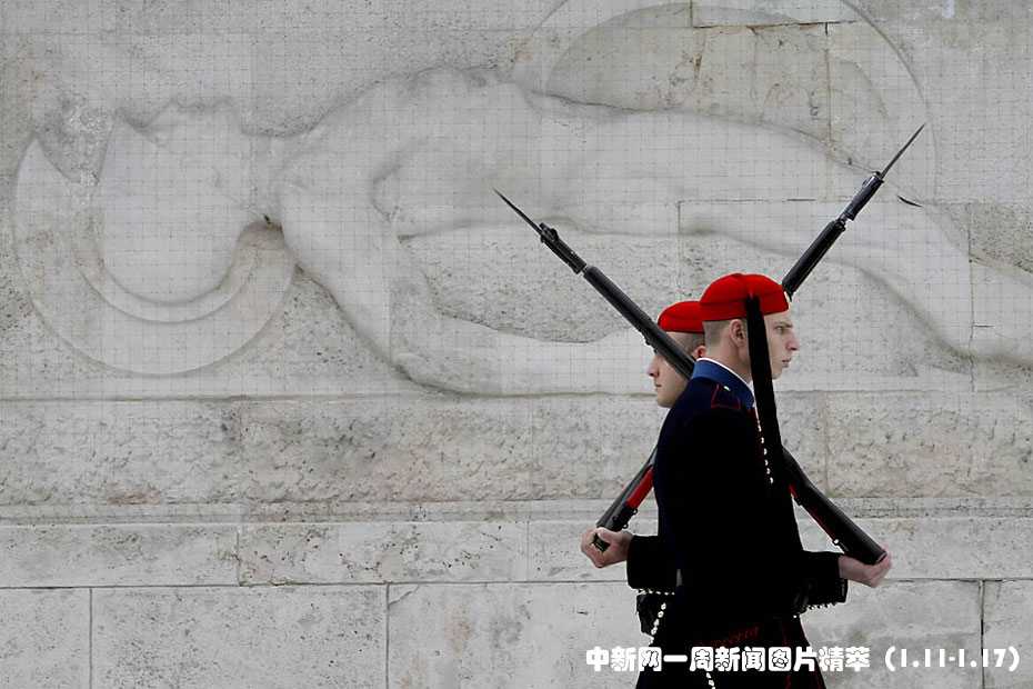 1月11日(周一),在雅典議會外,總統(tǒng)護(hù)衛(wèi)們進(jìn)行換崗交接儀式。希臘總統(tǒng)帕普利亞斯(Karolos Papoulias)向三名護(hù)衛(wèi)致謝,他們在上周六接到炸彈警報(bào)后堅(jiān)守崗位。此事造成的破壞不大,無人受傷。圖片來源:中國新聞網(wǎng)