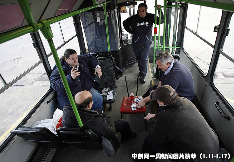 1月12日(周二),在布達(dá)佩斯一個汽車站,幾名司機在一輛城市公交車內(nèi)打牌。他們從周二開始罷工,要求提高工資并簽訂新的勞動合同。圖片來源:中國新聞網(wǎng)