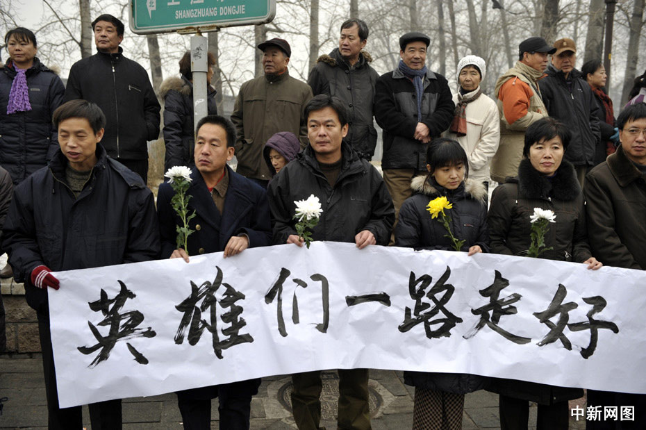 1月19日,北京民眾自發(fā)守候在通往北京八寶山殯儀館的路口迎接英烈的靈柩。當日,八位海地地震遇難中國維和警察的靈柩搭乘專機將抵達北京。中新網(wǎng)記者 金碩 攝