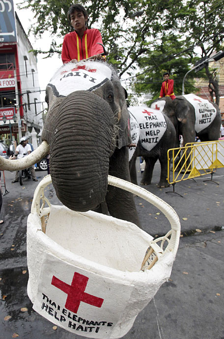 1月21日,在泰國首都曼谷舉辦了一場(chǎng)大象為海地災(zāi)區(qū)募捐活動(dòng)。人們紛紛向大象攜帶的籃子內(nèi)放入善款,向海地地震幸存者獻(xiàn)上一份愛心。圖片來源:中國新聞網(wǎng)