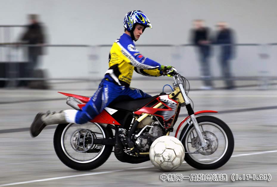 1月22日,國(guó)際摩托車(chē)貿(mào)易博覽會(huì)上,一場(chǎng)名為“魅力摩托”的足球比賽吸引了眾人的目光,參賽者駕駛摩托的同時(shí)還不忘將足球送入對(duì)方的大門(mén)。 圖片來(lái)源:中國(guó)新聞網(wǎng)>>點(diǎn)擊觀(guān)看詳細(xì)內(nèi)容