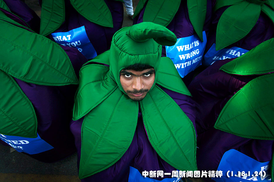 1月22日,印度班加羅爾綠色和平組織的活動(dòng)者打扮成茄子抗議食用轉(zhuǎn)基因茄子。圖片來源:中國(guó)新聞網(wǎng)