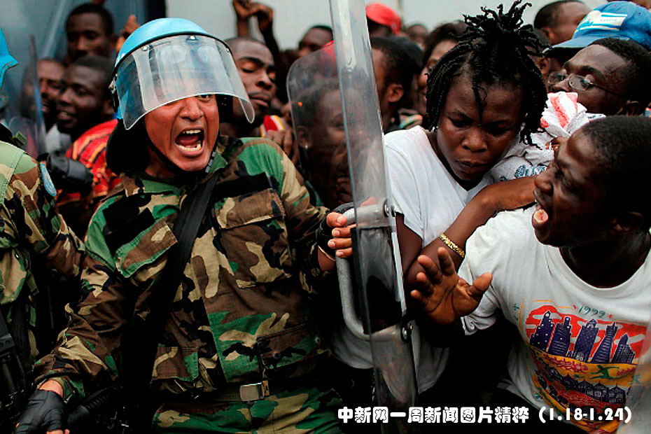 1月19日,在海地太子港,一名秘魯維和人員在試圖控制食品發(fā)放過程中混亂的人群時(shí)發(fā)出尖叫。圖片來源:中國新聞網(wǎng)