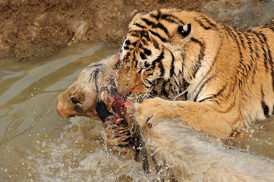 但水中的牦牛一動彈,更加激發(fā)了老虎的野性,這時有三、四只老虎撲了上來,工作人員拼命往水塘邊上拽牦牛,無奈一只虎王一下就咬住了牦牛的脖子怎么都不肯松口,繼而上演了人和老虎的“拔河比賽”。