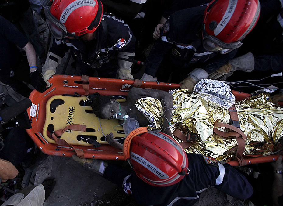 圖為法國救援人員將“可樂女孩”抬出廢墟。