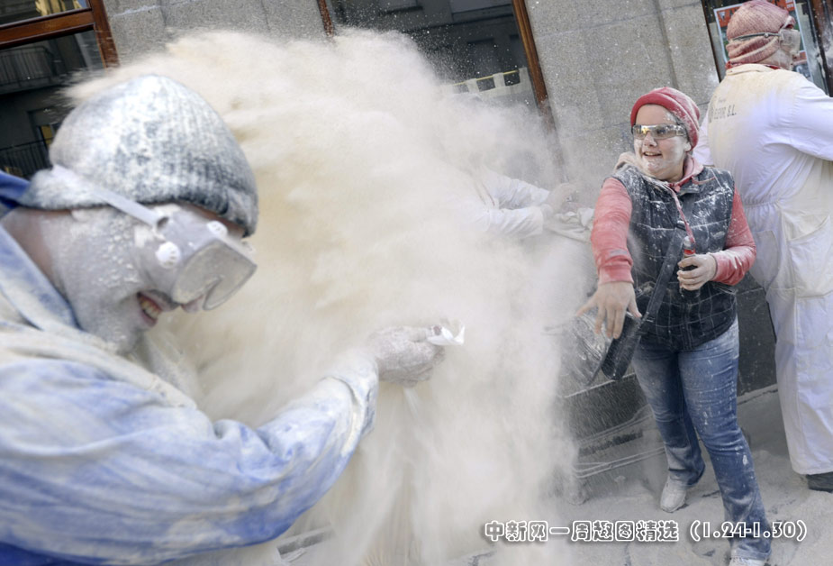 1月24日,西班牙西北部的一座村莊舉辦的狂歡節(jié)中上演瘋狂的“面粉大戰(zhàn)”。 圖片來源:中國新聞網(wǎng)>>點擊觀看詳細內(nèi)容