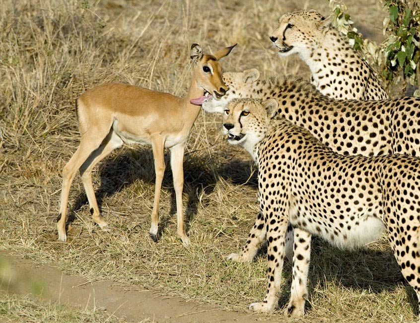 據(jù)英國媒體28日報(bào)道,一名在肯尼亞野生動(dòng)物保護(hù)區(qū)拍照的攝影師拍到令人驚訝的畫面:三只獵豹與一只本是其獵物的小羚羊竟然和睦相處,共同嬉戲玩鬧,完全沒有危險(xiǎn)“天敵”的概念。小羚羊最終毫發(fā)無傷地逃生成功。