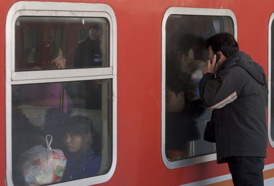 一年一度的春運(yùn)今日起正式開(kāi)始。2010年的春運(yùn)從1月30日起至3月10日,為期40天,其中節(jié)前15天,節(jié)后25天。據(jù)權(quán)威預(yù)測(cè),今年春運(yùn)客運(yùn)量料超25億人次。圖為一個(gè)男子在和已經(jīng)上了車的女朋友打電話,囑咐她看好行李。吳家翔 攝