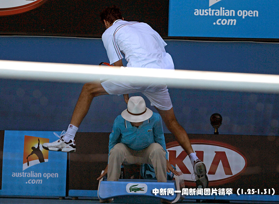 1月26日(周二),在澳網(wǎng)男子四分之一決賽上,克羅地亞選手西里奇(Marin Cilic)在對(duì)陣美國選手羅迪克(Andy Roddick)時(shí)為救球從邊裁頭頂跳過。圖片來源:中國新聞網(wǎng)