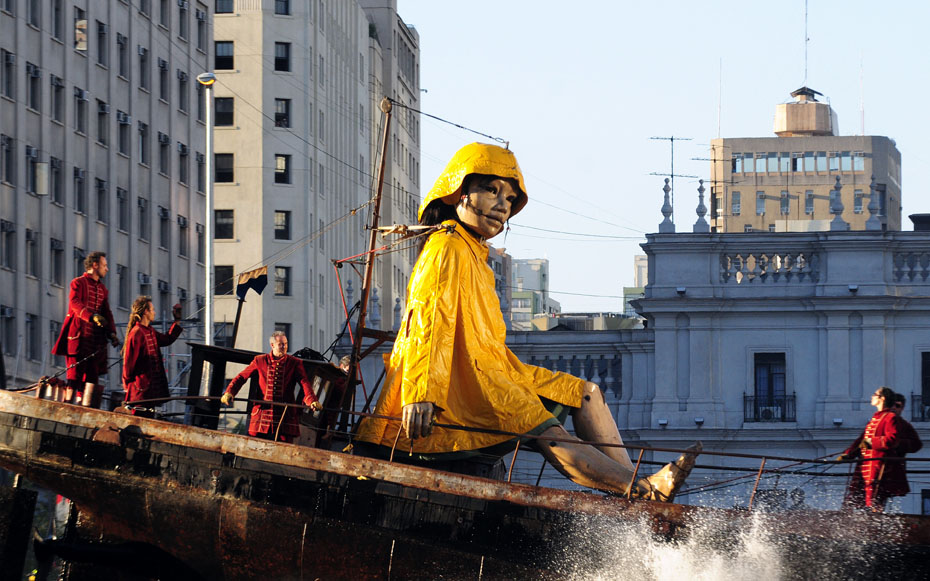 近日,智利首都圣地亞哥街頭,法國(guó)一劇團(tuán)攜巨型提線木偶“小巨人”上街表演,它惟妙惟肖的表情和逼真的神態(tài)引得周圍觀眾的陣陣掌聲。圖片來源:中國(guó)新聞網(wǎng)
