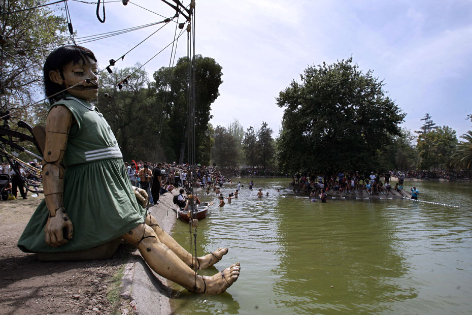近日,智利首都圣地亞哥街頭,法國一劇團攜巨型提線木偶“小巨人”上街表演,它惟妙惟肖的表情和逼真的神態(tài)引得周圍觀眾的陣陣掌聲。圖片來源:中國新聞網(wǎng)