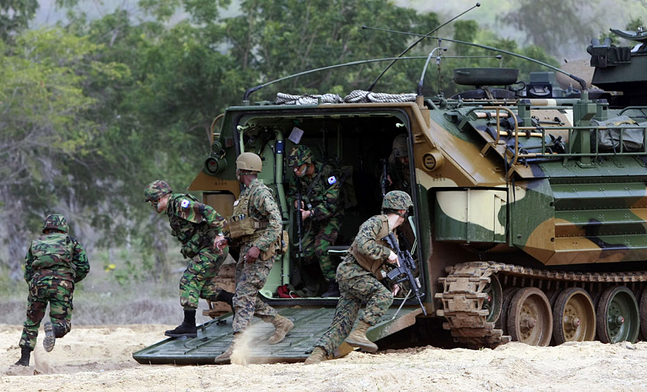 2月4日,參加“金色眼鏡蛇”聯(lián)合軍演的各國軍隊,在泰國的Rayong省沙灘進(jìn)行了兩棲登陸演練。本次聯(lián)合軍演共有來自泰國、美國、印度尼西亞、新加坡、日本、韓國的約1.4萬名軍人參加。圖片來源:中國新聞網(wǎng)