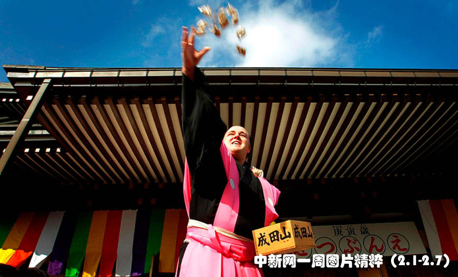2月3日(周三),在日本千葉成田的一座寺廟,相撲新手、來自愛沙尼亞的巴魯托(Baruto)向人群拋撒袋裝的大豆。這種儀式通常在農(nóng)歷新年進行,據(jù)說可以帶來好運。圖片來源:中國新聞網(wǎng)