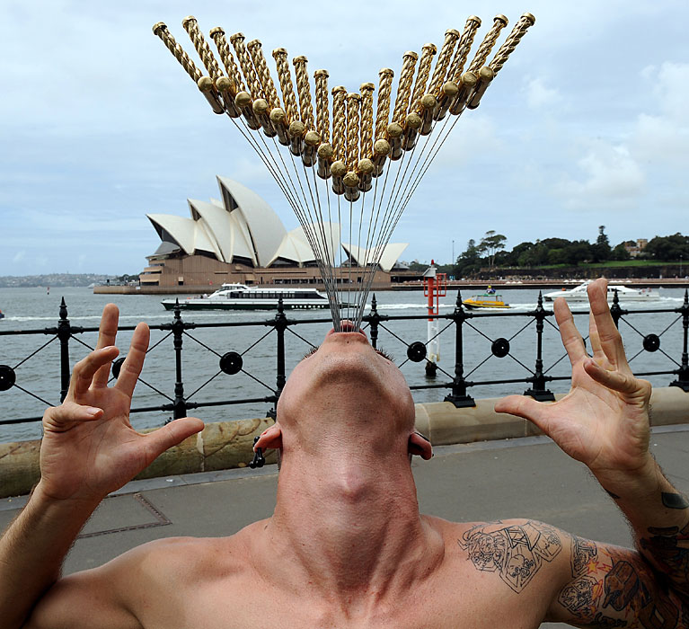 2月8日,街頭藝人Chayne Hultgren在澳大利亞悉尼海港大橋前,一次吞下18把厚約1.3厘米,長約50.8厘米的長劍,刷新了吉尼斯世界紀(jì)錄。圖片來源:中國新聞網(wǎng)