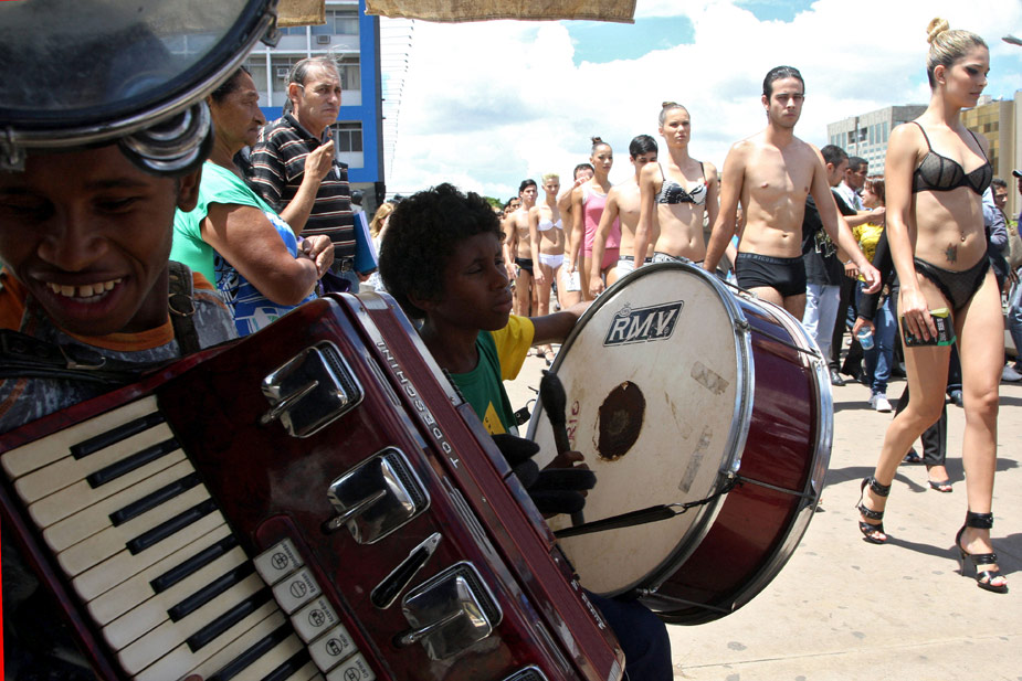 當?shù)貢r間2月9日,巴西首都巴西利亞的一座公共汽車站,一群身穿性感內衣的模特招搖過市,吸引大批路人注目,當天是巴西的內衣日。