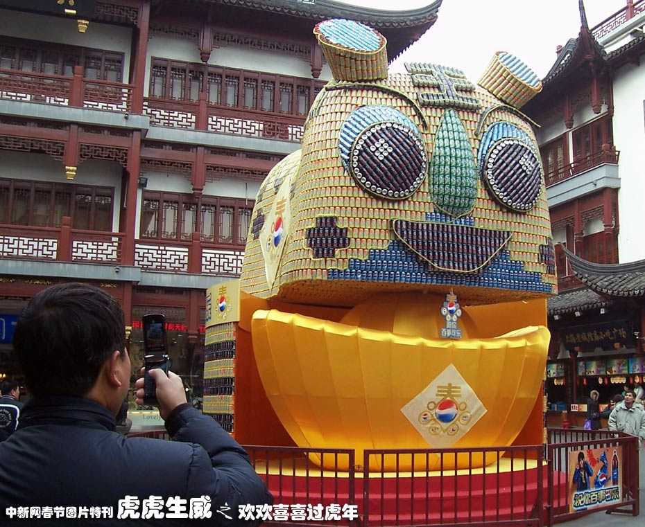 1月5日,一只用數(shù)萬個易拉罐搭成的高達(dá)七米的卡通虎亮相上海豫園商城廣場,迎接虎年新春的到來,吸引中外游客觀賞留影。中新社發(fā) 周東潮 攝