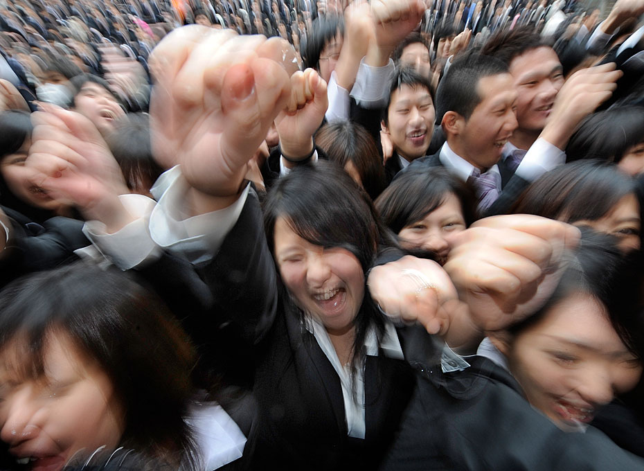 2月10日,日本東京職業(yè)學校的學生在求職動員會上伸出拳頭展現(xiàn)信心。日本的失業(yè)率達5%,2011屆畢業(yè)生將面臨嚴峻就業(yè)形式。圖片來源:中國新聞網(wǎng)
