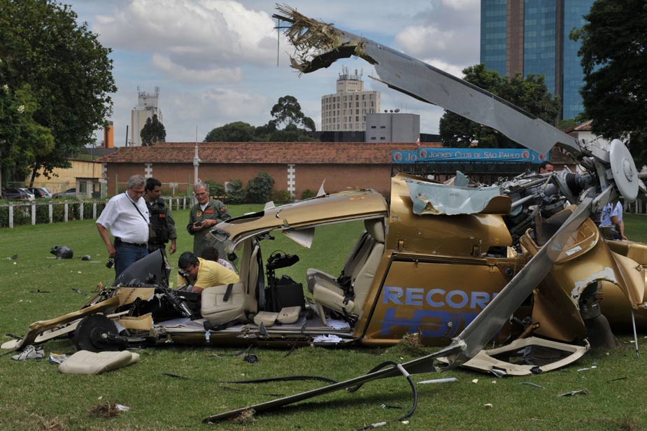 當(dāng)?shù)貢r(shí)間2月10日上午,巴西記錄電視臺(tái)的一架直升機(jī)在巴西圣保羅南部一賽馬俱樂部的草坪上墜落,一名飛行員當(dāng)場(chǎng)身亡。圖片來源:中國(guó)新聞網(wǎng)