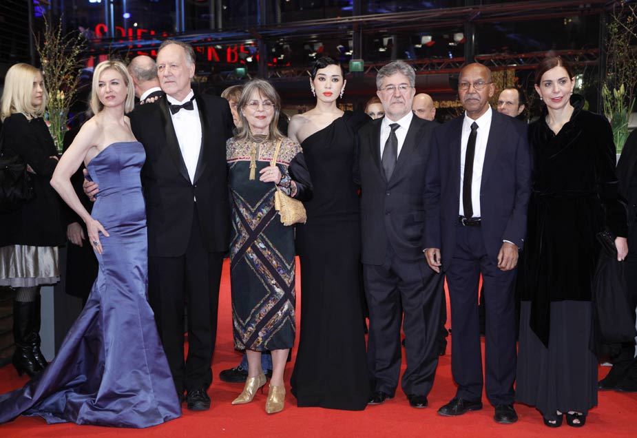 當?shù)貢r間2月11日晚,第60屆柏林電影節(jié)在風雪交加的嚴寒中盛大揭幕。圖為本屆電影節(jié)評委陣容集體亮相。