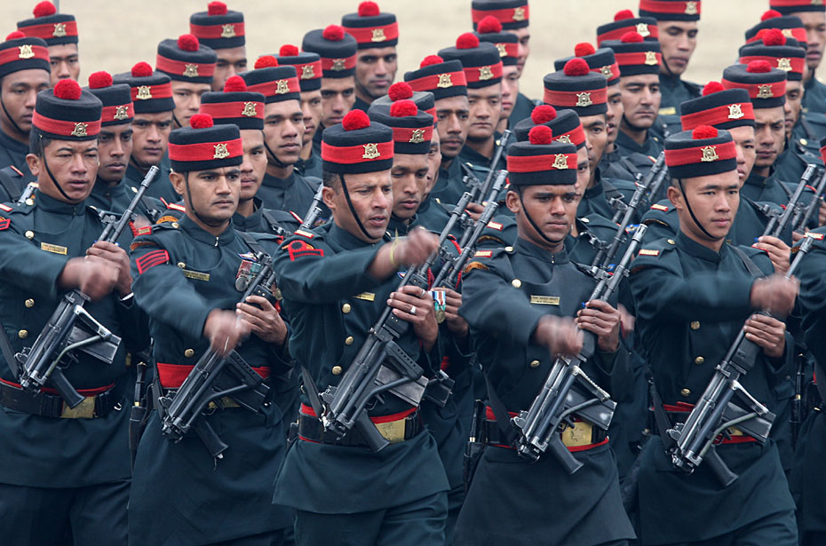 當(dāng)?shù)貢r間2月12日,尼泊爾士兵在首都加德滿都舉行了建軍節(jié)閱兵式。尼泊爾總統(tǒng)和總參謀長檢閱了受閱部隊。圖片來源:中國新聞網(wǎng)