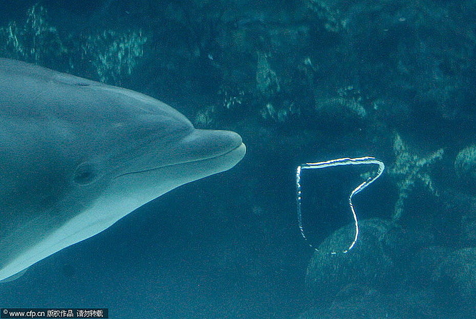 近日,美國奧蘭多海洋世界的一只寬吻海豚吹出“心形”氣泡,似乎要在情人節(jié)來臨前夕傳達濃濃愛意。圖片來源:CFP