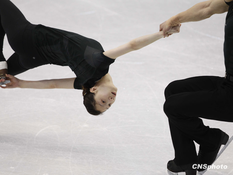 當(dāng)?shù)貢r(shí)間2月13日,中國花樣滑冰隊(duì)龐清/佟健、張丹/張昊在溫哥華太平洋體育館,利用最后的休息時(shí)間重復(fù)練習(xí)積極備戰(zhàn)即將到來的比賽。中新社記者 盛佳鵬 攝