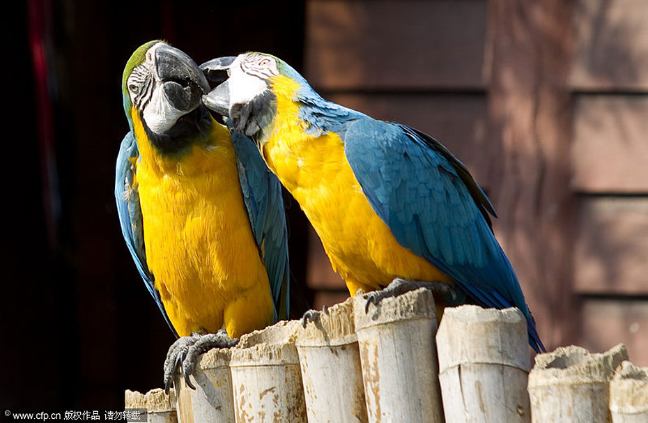 圖為上海野生動物園,一對金剛鸚鵡在相互梳理羽毛。劉行喆/CFP