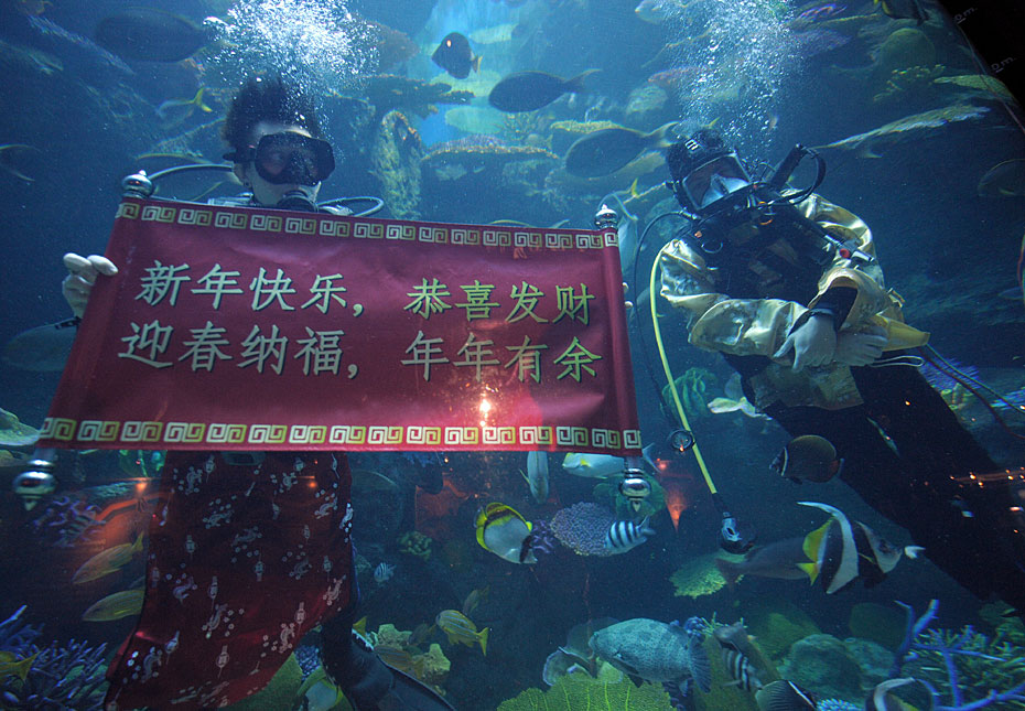 圖為泰國曼谷水族館潛水員在水中拉起橫幅慶祝新春佳節(jié)。