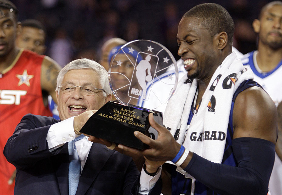 圖為東部明星聯(lián)隊球員韋德(右)接受MVP最有價值球員獎杯。