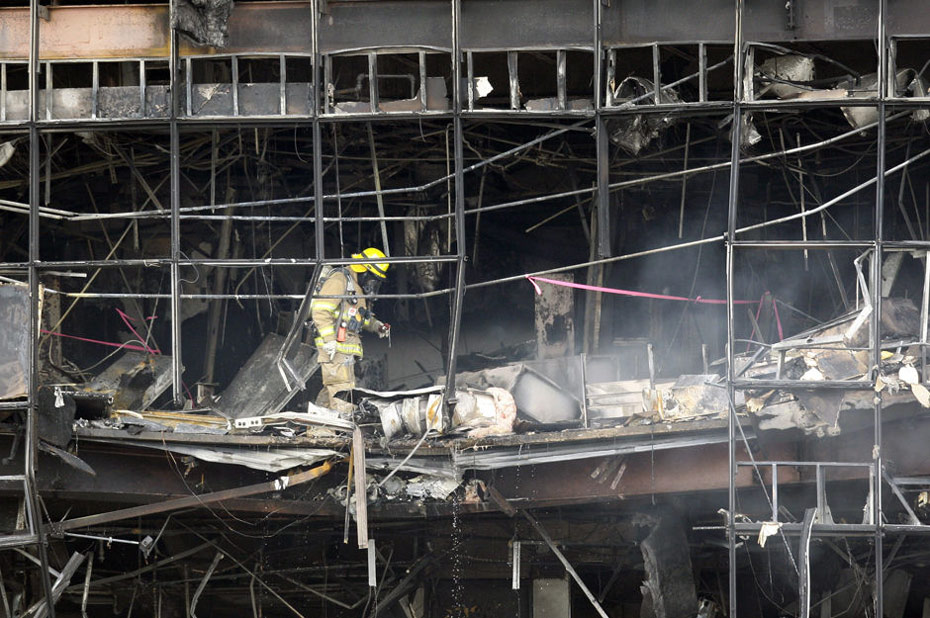 撞機事件導(dǎo)致大樓一面的幾十扇窗戶粉碎,一些樓層天花板塌陷,通過電視畫面,可以看到大樓二三樓層濃煙滾滾,黑煙中不時有竄出的火焰。