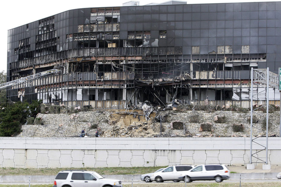 一架低空飛行的小型飛機(jī)18日撞入德克薩斯州奧斯汀市國(guó)稅局的辦公大樓,當(dāng)?shù)毓賳T表示這可能是一件蓄謀事件。圖片來源:中國(guó)新聞網(wǎng)