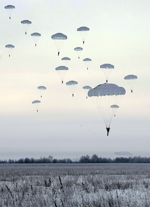 2月18日,俄羅斯第98空降師在莫斯科以東320公里的伊萬諾沃市附近舉行雪地空降演習(xí)。圖片來源:中國新聞網(wǎng)
