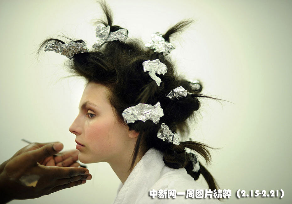 2月17日(周三),一個模特在2010年紐約秋季時裝周后臺化妝。