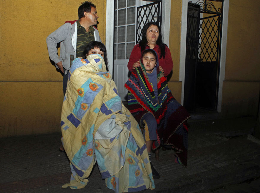 美國地震勘測局報(bào)告稱,智利康塞普西翁省附近當(dāng)?shù)貢r間27日凌晨發(fā)生里氏8.8級強(qiáng)烈地震,首都圣地亞哥有明顯震感。智利總統(tǒng)巴切萊特已宣布國家進(jìn)入“災(zāi)難狀態(tài)”。目前強(qiáng)烈地震造成的死亡人數(shù)已經(jīng)升至78人。圖為在智利首都圣地亞哥,正在熟睡中的人們感到地震后紛紛走到戶外。