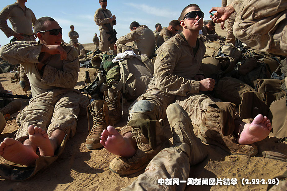 23日(周二),在阿富汗馬爾賈城,美軍陸戰(zhàn)隊(duì)士兵們在行動結(jié)束后坐下來休息。