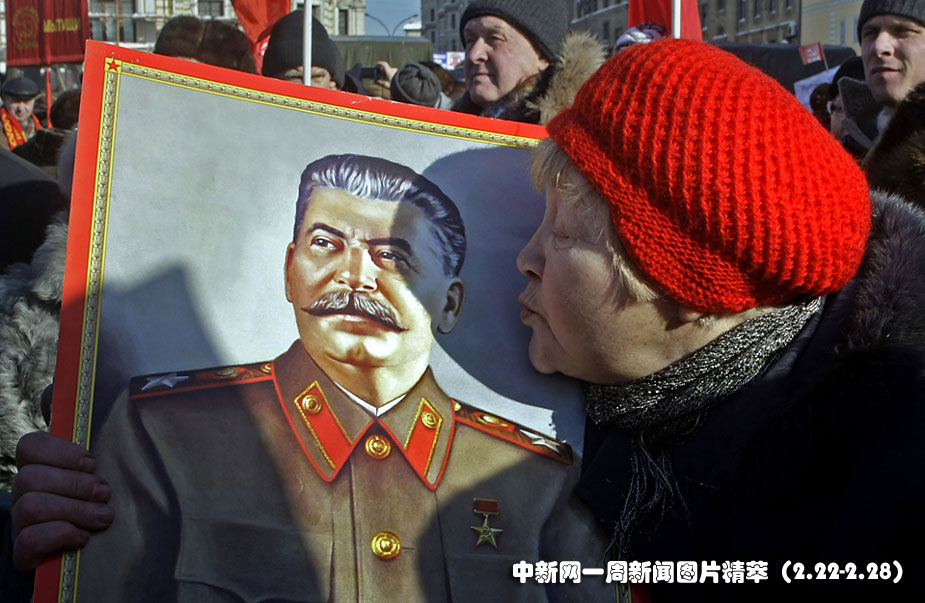 23日(周二)為慶祝俄羅斯祖國保衛(wèi)者日,共產(chǎn)黨員在莫斯科進(jìn)行了大游行。一位女士在游行中親吻斯大林的畫像。