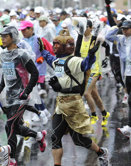 2月28日,日本東京馬拉松賽舉行,超過30000名愛好者參加了此次馬拉松賽。很多參賽者的怪異服裝成為了賽場上的一道風(fēng)景。圖片來源:中國新聞網(wǎng)