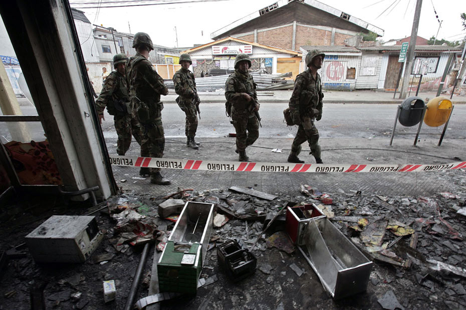 3月2日,智利軍警在街頭維持秩序。智利總統(tǒng)巴切萊特當(dāng)日說,政府派往災(zāi)區(qū)維持治安的軍人數(shù)量已達14000人,地震重災(zāi)區(qū)的搶劫現(xiàn)象已得到控制。圖片來源:中國新聞網(wǎng)