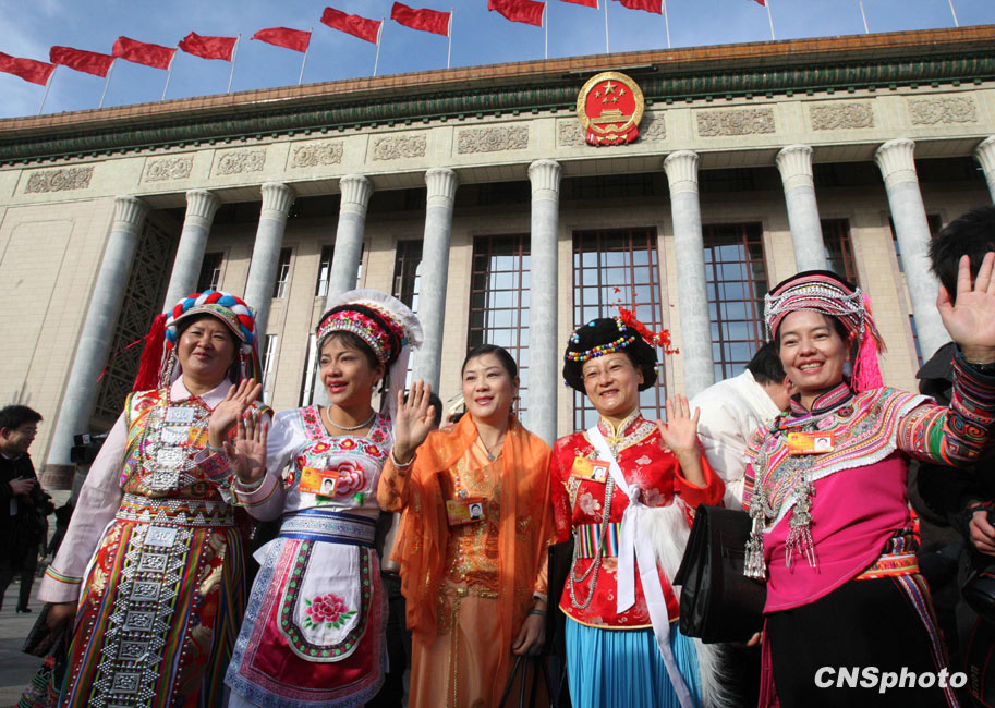 3月5日上午9時(shí),十一屆全國人大三次會(huì)議在北京隆重開幕。國務(wù)院總理溫家寶作政府工作報(bào)告。圖為少數(shù)民族女代表盛裝出席人大開幕會(huì)。 中新社發(fā) 湯彥俊 攝