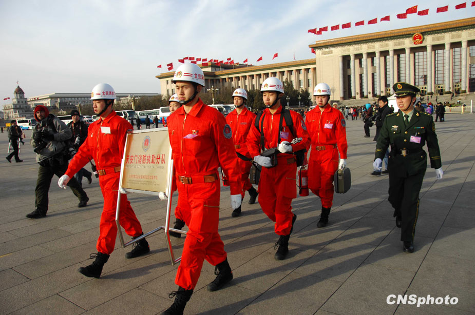 3月5日上午9時(shí),十一屆全國人大三次會(huì)議在北京隆重開幕。國務(wù)院總理溫家寶作政府工作報(bào)告。圖為武警消防官兵提前進(jìn)入天安門廣場(chǎng),保障會(huì)議安全。中新社發(fā) 柯小軍 攝