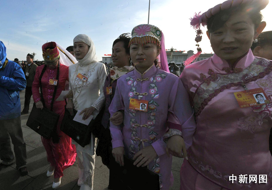 十一屆全國人大三次會議3月5日在北京開幕,各民族人大女代表的服飾靚麗多彩,在天安門廣場前大展英姿。 中新社記者 賈國榮 攝