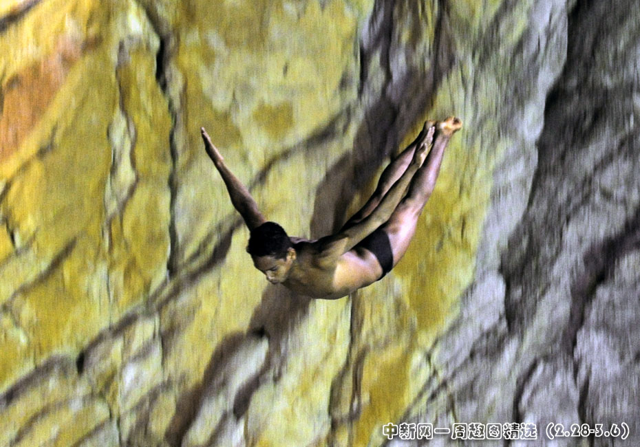 3月1日,墨西哥一名懸崖跳水愛好者手持火把,在該國南部城市阿卡普爾科的“拉·奎布拉達(dá)”懸崖上跳水。此種傳統(tǒng)可追溯至1934年。當(dāng)時,住在阿卡普爾科市的兩位鄰居相互“挑戰(zhàn)”,通過從懸崖上跳向海中來比試各自的勇氣和力量。圖片來源:中國新聞網(wǎng)>>點擊觀看詳細(xì)內(nèi)容