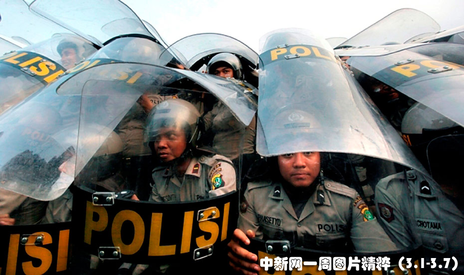 3月3日,印度尼西亞首都雅加達(dá)國(guó)會(huì)門外,警察用盾牌保護(hù)自己免受反政府示威者投擲的石塊的傷害。圖片來源:中國(guó)新聞網(wǎng)