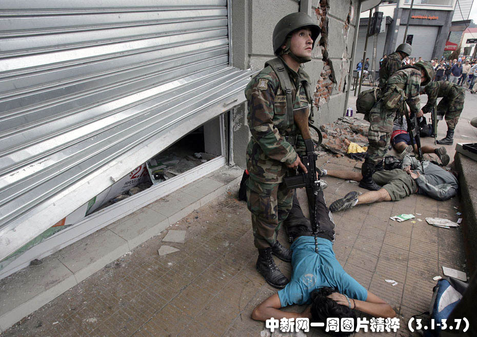 3月2日,智利軍警在街頭維持秩序。智利總統(tǒng)巴切萊特當(dāng)日說,政府派往災(zāi)區(qū)維持治安的軍人數(shù)量已達(dá)14000人,地震重災(zāi)區(qū)的搶劫現(xiàn)象已得到控制。圖片來源:中國新聞網(wǎng)