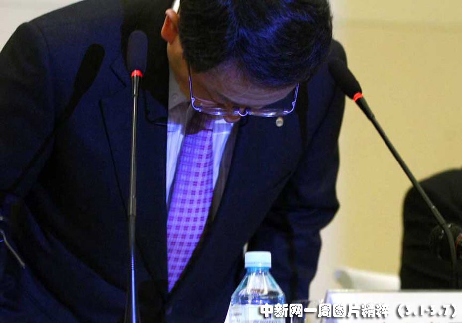 3月1日,豐田汽車總裁豐田章男今日在北京舉行記者會(huì),介紹了豐田汽車大規(guī)模召回的原因及處理措施,并向中國(guó)消費(fèi)者鞠躬道歉。圖片來源:中國(guó)新聞網(wǎng)