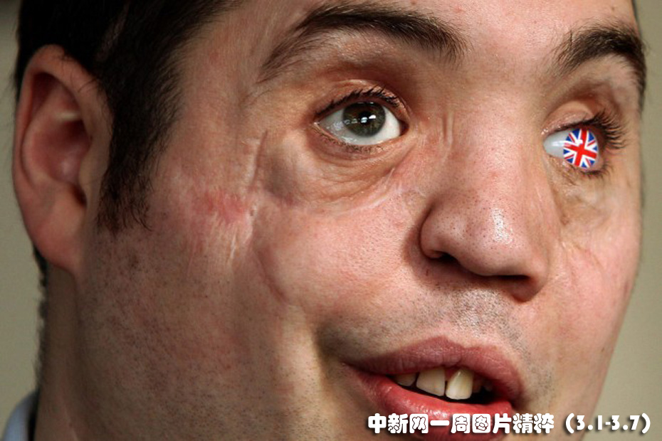 3月1日,威廉王子訪問了威爾士蘭迪德諾的一所康復中心,F年31歲的西蒙•布朗戴上裝飾有英國國旗的假眼歡迎威廉王子。西蒙在2006年的伊拉克巴士拉服兵役期間被狙擊手擊瞎了左眼。圖片來源:中國新聞網