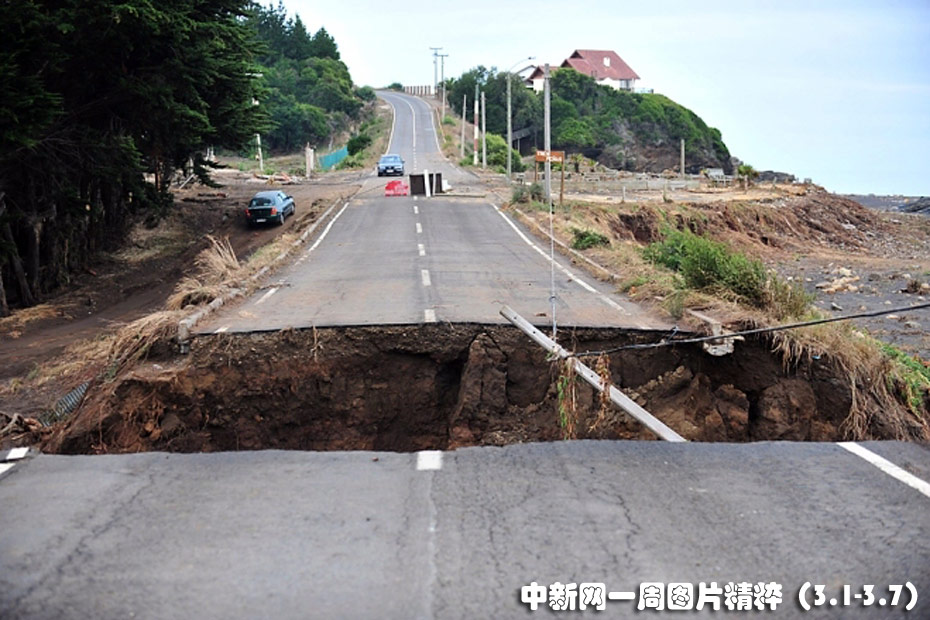 3月2日,在智利佩尤韋,一條公路發(fā)生斷裂。智利大地震已過(guò)去3天,目前已有至少796人喪身。智利總統(tǒng)巴切萊特稱,部隊(duì)已經(jīng)部署到位。此外她還會(huì)見了美國(guó)國(guó)務(wù)卿希拉里•克林頓。政府部門已經(jīng)開始分發(fā)食物。圖片來(lái)源:中國(guó)新聞網(wǎng)